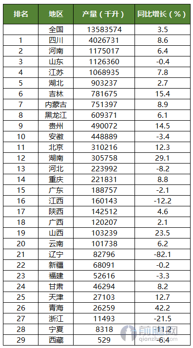 2016年全國(guó)白酒(折65度)總產(chǎn)量為135.84億升,同比上漲3.5%。其中四川省白酒年產(chǎn)量402.67萬(wàn)千升,增長(zhǎng)8.65%,位居全國(guó)第1位;河南省白酒產(chǎn)量117.50萬(wàn)千升,增長(zhǎng)6.4%,位居全國(guó)第2位;山東省白酒年產(chǎn)量112.64萬(wàn)千升,下降0.4%,位居全國(guó)第3位。